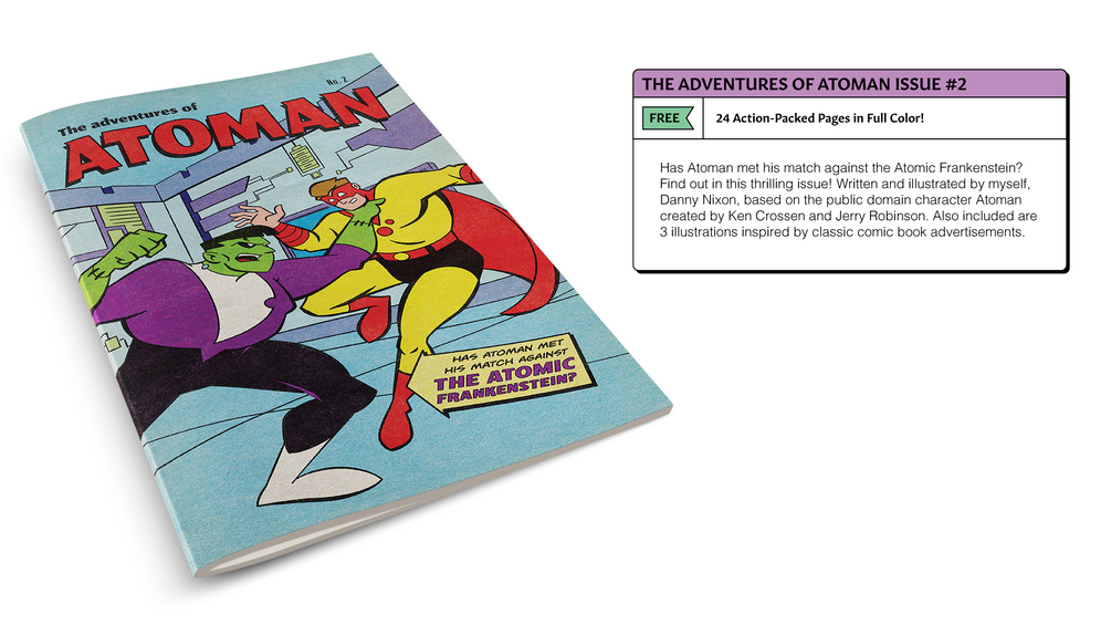 Written and illustrated by myself, Danny Nixon based on the public domain character Atoman created by Ken Crossen and Jerry Robinson. Also included are 3 illustrations inspired by classic comic book advertisements.